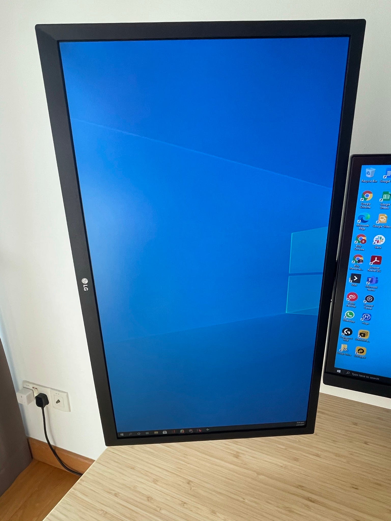 My screen setup is inspired by techie friends of mine that would have a vertical screen for reading code. I am totally hooked on it now. The vertical screen for putting Whatsapp, articles or blogs is so efficient, you never want to go back to even a widescreen setup. My middle screen typically has email on one half and then Chrome on the other. If I am doing work on Excel, maximising it across the widescreen makes editing and error checking hassle-free. Make sure you get heavy-duty arms to hold them both up