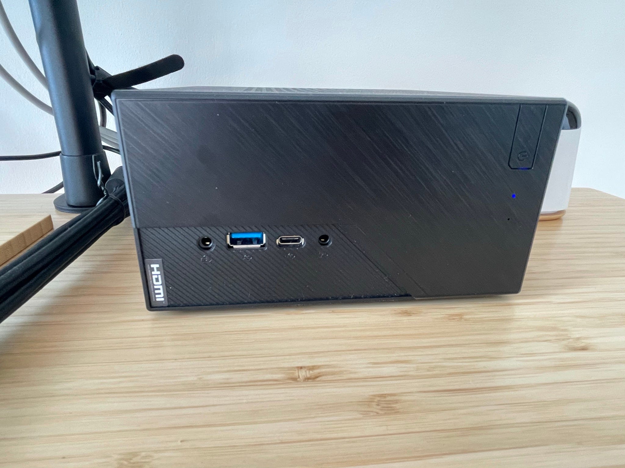 Another local champion making super sexy PCs called Aftershock. I looked around at a lot of the mini PCs, some from Dell (Too boring and office-like) and Louqe but what tipped the Aftershock Mini PC over the edge was the flexibility of the port setup and its size. You need two display ports to drive the two monitors (one HDMI and one Displayport with an adaptor). The PC is small enough for the table and is super quiet so you barely even notice it.